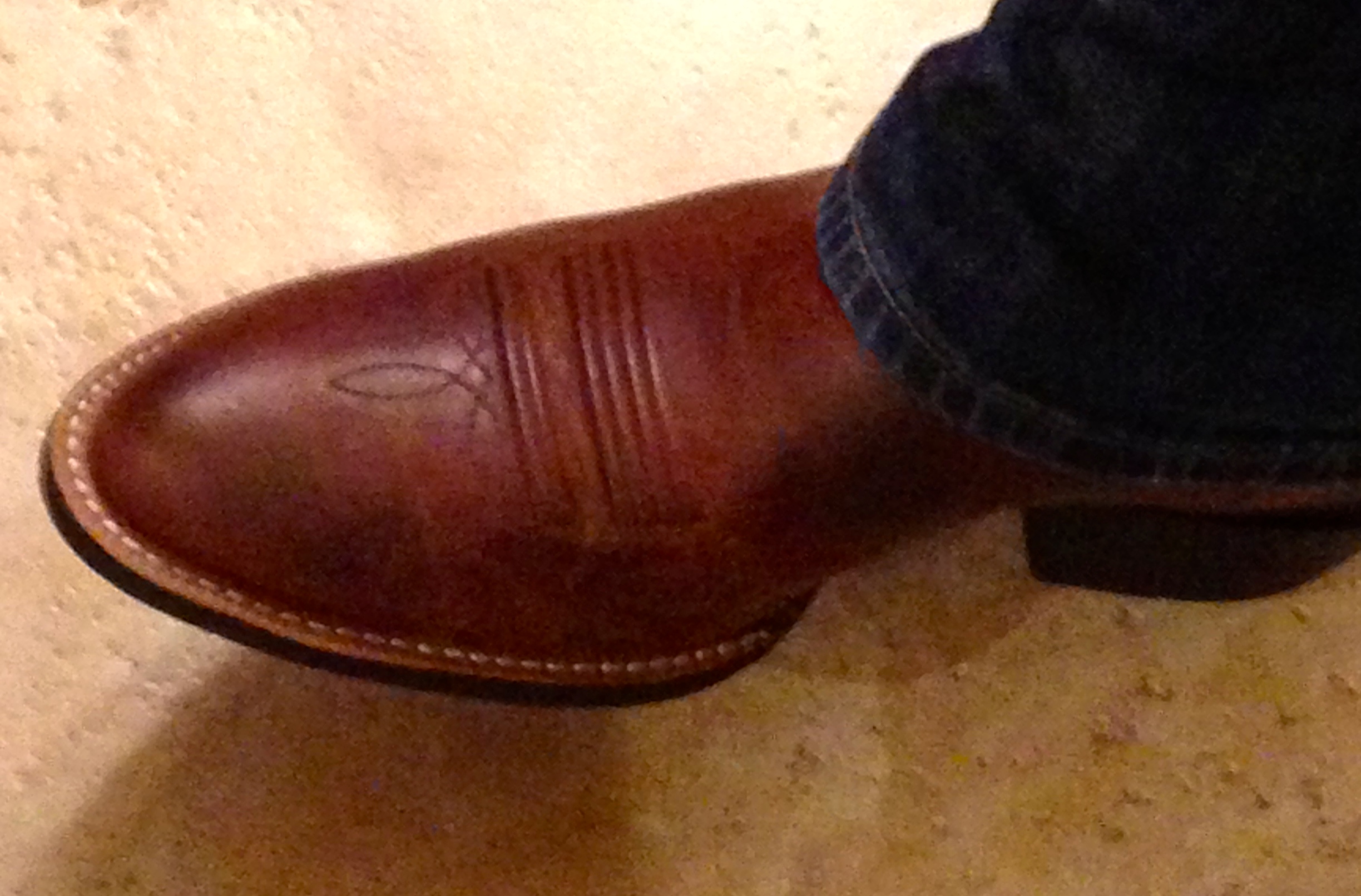 He bought his very first pair of western boots and they look great on him! Now, will he ever actually wear them? He will when I take him to the Rascal Flatts concert this September.