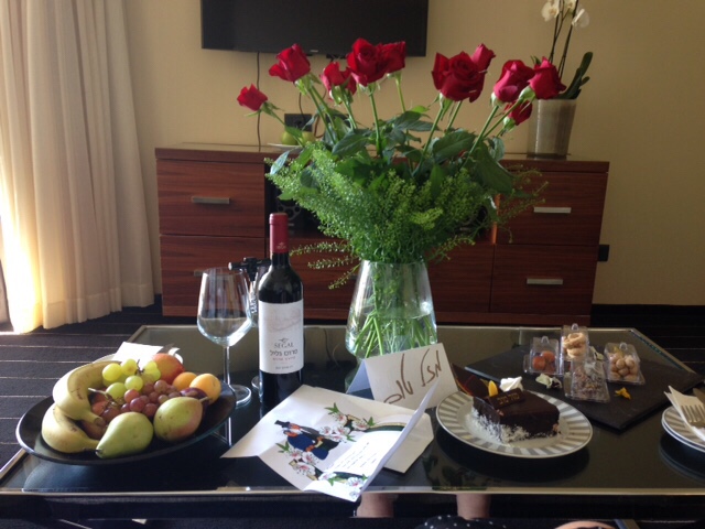 10. Even if you are far apart on your anniversary, the surprise of roses, cake, wine and fruit in your spouse’s hotel room bodes well for another year of marriage!!!